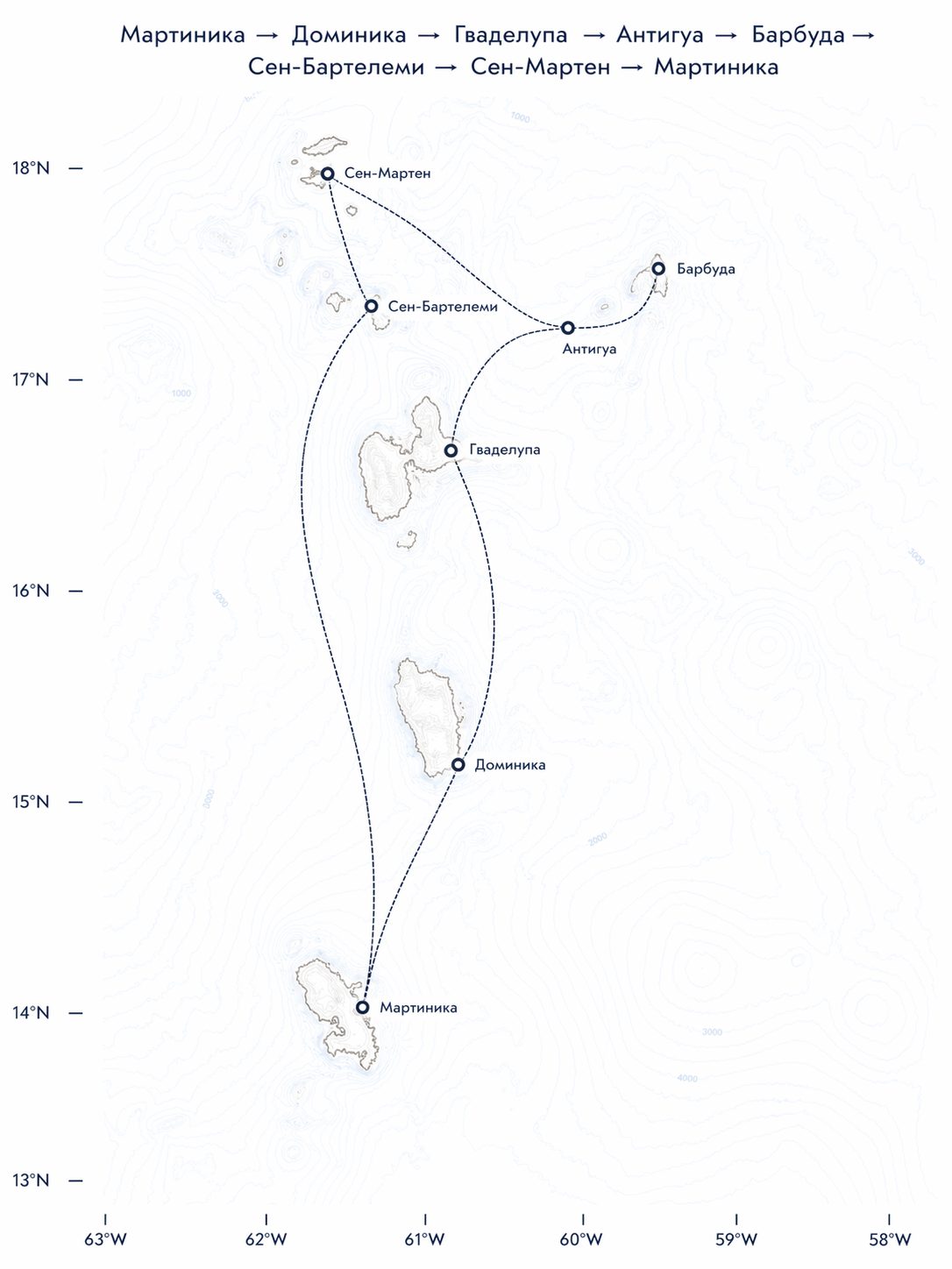 Мартиника → Доминика → Гваделупа → Антигуа → Барбуда → Сен-Бартелеми → Сен-Мартен → Мартиника